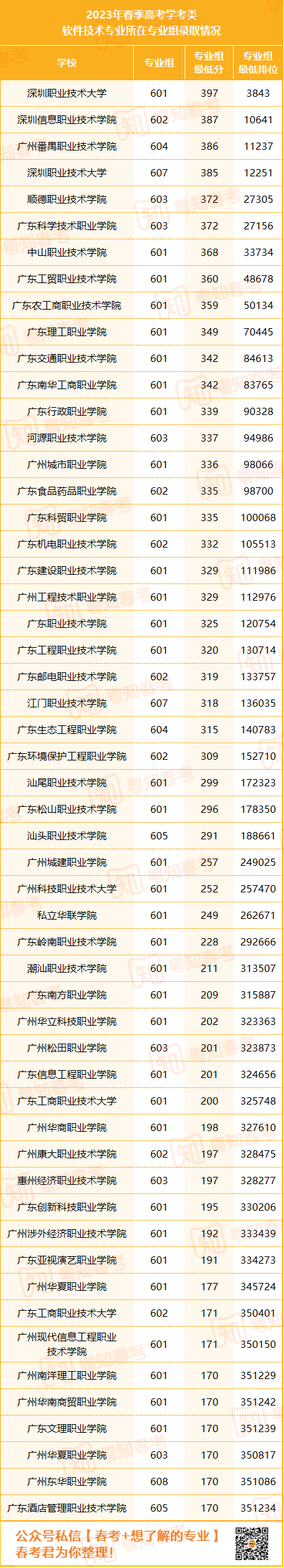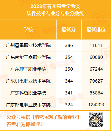 2023年有六所学校发布了专业录取分数线,番禺职业技术学院的软件技术专业分数线达到了386分,而广东南华学院和广东理工学院的分数线也都超过了350分。整体来看,分数线普遍较高。从这个结果可以看出,若想进入这些知名院校学习该专业,学生必须取得优异的成绩。