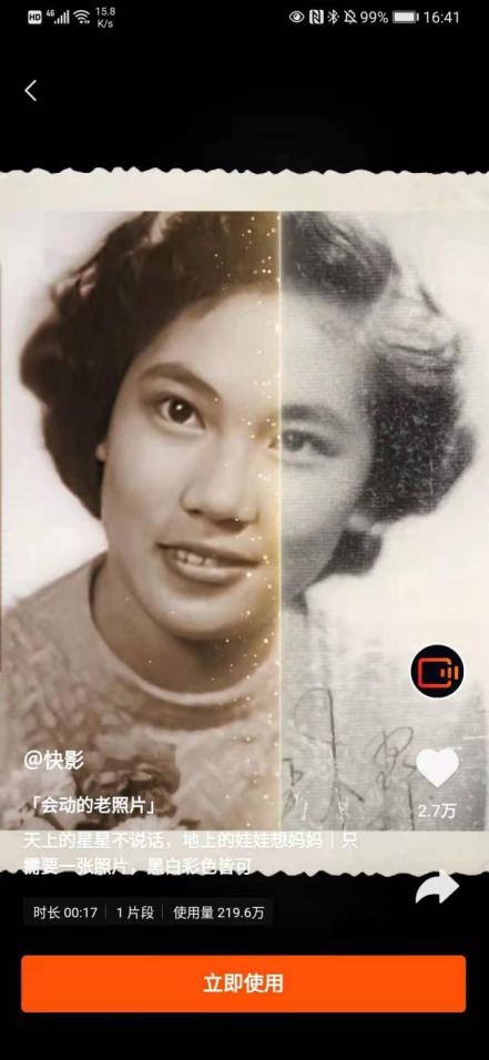 近期,快手与快影两款软件同步发布了“动态历史照片”模板。这一功能一经问世,便赢得了用户们的热烈追捧。在快手APP中,已有超过72万人次尝试修复动态老照片,相关话题下涌现了近4.5万件作品。而在快影APP中,使用次数更是达到了344万次。众多用户积极参与,充分体现了该功能的强大吸引力。