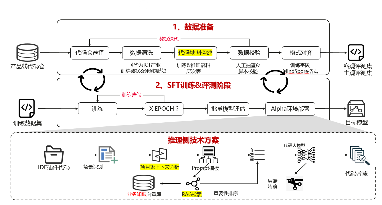 在训练流水线上,五个脚本工具获得了业务专家的肯定并得以实施,包括数据清洗工具和SFT提取工具等。同时,对训练语料的详细信息也进行了明确。在L1阶段,对30亿条华为语料库的数据进行了清洗,覆盖了超过十个产品线,从而提升了业务代码的基础能力。这些步骤使得模型训练逐渐趋向完善。