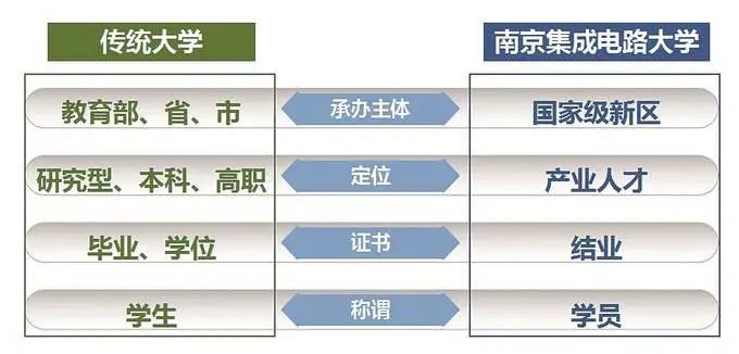 2019年,6部门发文设立产教融合创新平台。南京提出建设“南京集成电路产业创新学院”,并给予经费支持。在此基础上,江北新区管委会依据产业需求建设了南京集成电路大学。这是一次突破传统教育体系的创新尝试。该校以实训带教为主,目的是培养实践与专业技能兼备的产业人才。