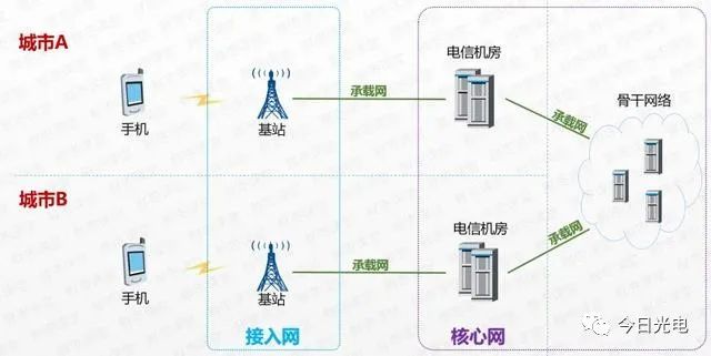 通信网络从1G起步,后来逐步发展到4G。其逻辑架构长期固定不变。手机先接入接入网,接着经承载网到达核心网,然后通过另一段承载网和接入网抵达另一部手机。虽然技术不断变化,但这个架构主导了通信发展进程。过去十几年,全球通信网络都按此架构搭建,用以支撑数十亿用户的通信需求。