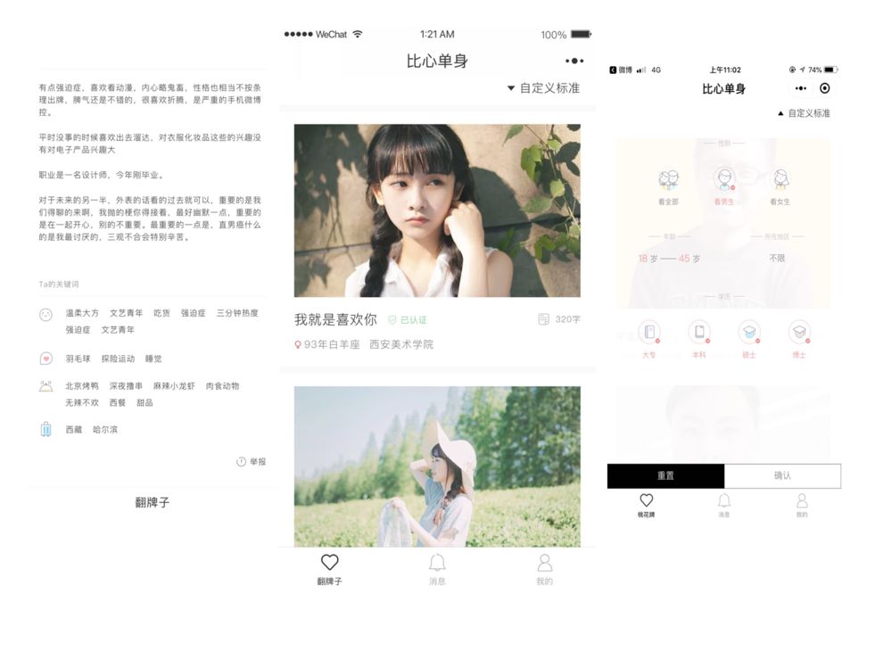 团队发现有了一定数量的用户。然而他们觉得APP体积庞大。推广所需费用高昂。并且上线之后用户质量欠佳。经过权衡。他们将发展重点聚焦于小程序。到现在,“比心单身”小程序已上线10个月。累计有9万多用户。其中约8000人是完善资料的注册用户。日均访问量达40000次。每天约2000人打开主页面。用户平均停留时长为6分钟。通过“翻牌子”,每天约200人加微信好友。