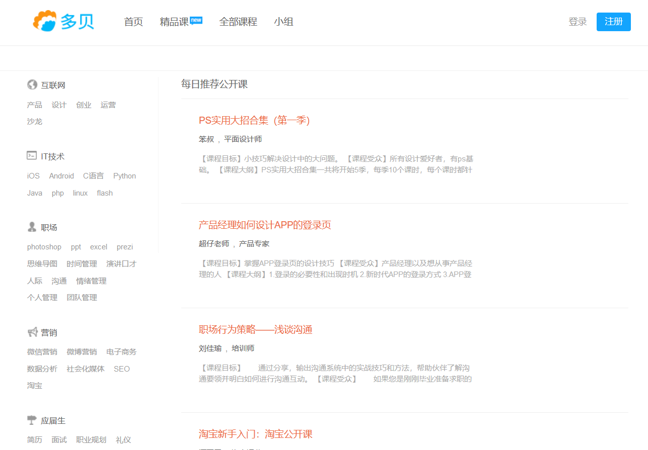 腾讯课堂由腾讯大厂推出,有收费课程,也有免费课程。它适合互联网行业从业者。课程涵盖产品、设计等多个领域。在这里还能看到腾讯员工学习的课程。