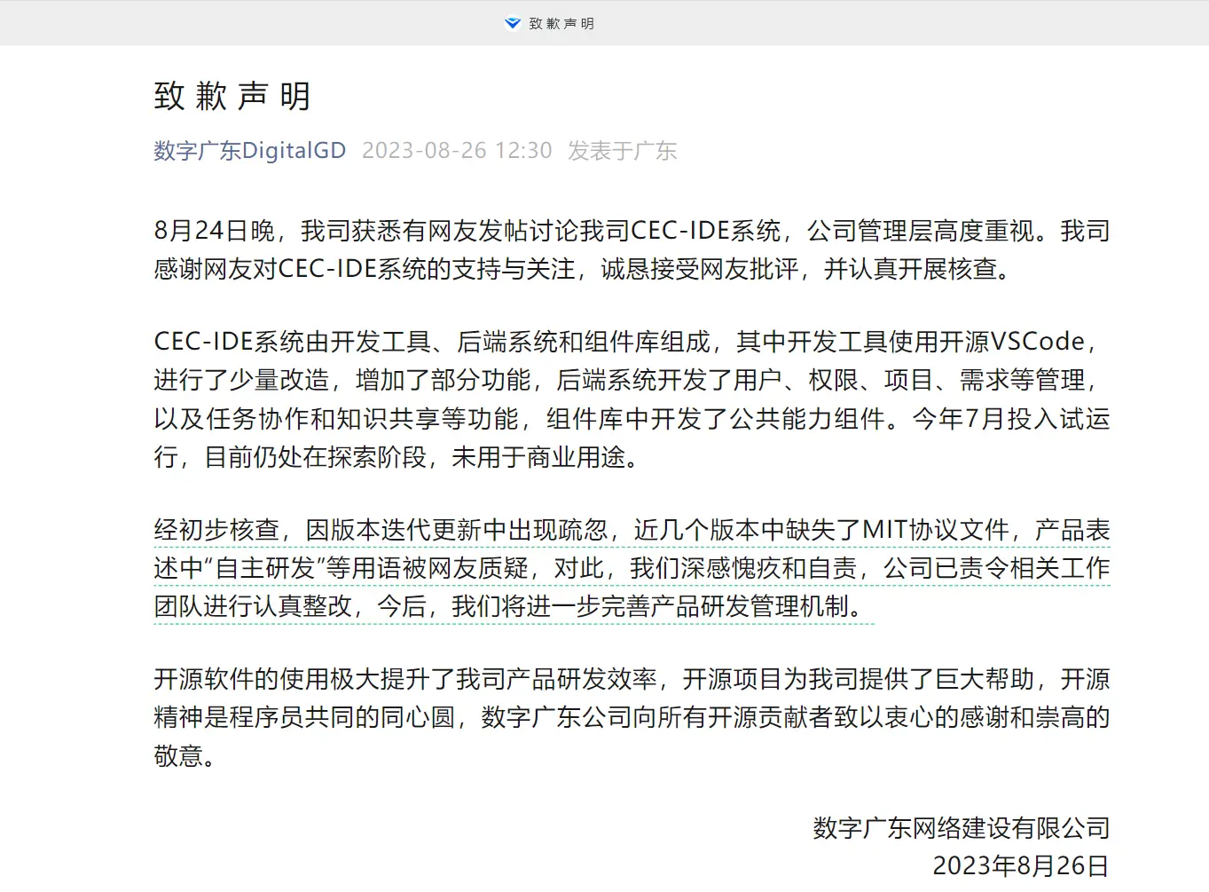 8月26日,数字广东发布了CEC – IDE致歉声明。这一消息迅速吸引了众人目光。大家不禁好奇声明背后究竟藏着什么故事。是产品出现了问题?还是存在别的状况?在众多开发者关注集成开发工具的当下,这样一则声明确实让人对后续发展充满好奇。