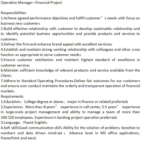 公司的发展需要人才的助力,因此,公司主动寻求那些经验丰富的专家。在挑选团队管理者时,公司特别强调候选人必须具备至少两年的、管理规模超过60人的呼叫中心的工作背景。而且,公司也非常注重提升员工的技能水平,每个月都会定期组织技能培训班。