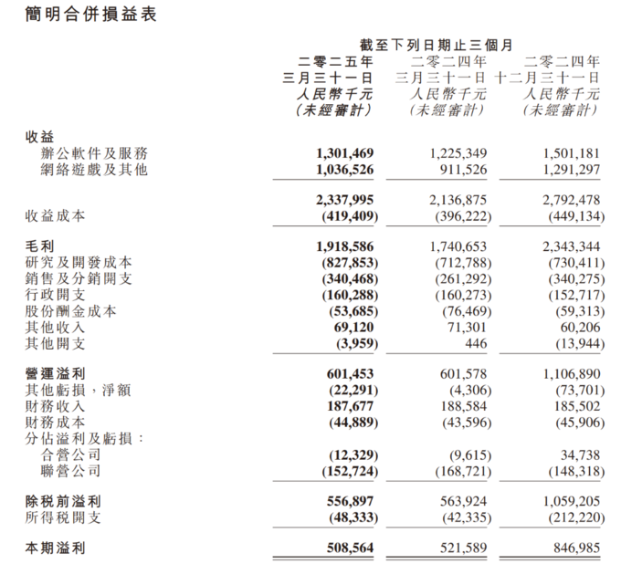 金山软件在研发领域的投入已攀升至8.28亿元,较去年同期上涨了16%,环比增幅更是达到了13%。这一增长主要得益于员工数量的扩充,AI相关支出的增加,以及对网络游戏领域新游戏类型的加大投入。但值得注意的是,这种研发成本的明显上升,给公司带来了不小的财务负担,因为这笔投入的增加并未直接导致利润的同步增长。