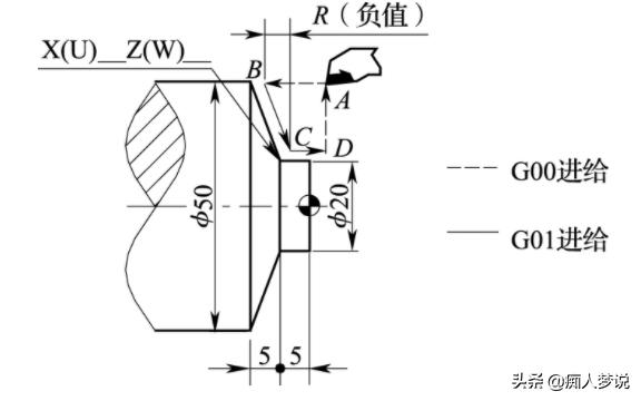 在G94操作模式下,刀具的运动轨迹被细分为两类,一类用于平面切削,另一类用于锥面平面切削。刀具从循环的起始点出发,按照既定路径移动,最终回到起点。在这个过程中,虚线部分展示了刀具的快速移动,而实线部分则按照F值所设定的进给速度进行切削。在端面切削的路径上,刀具必须按照既定规则进行加工。对于锥度端面的切削,必须特别关注锥度的起始和结束位置。在这一过程中,R 值扮演着至关重要的角色。具体来说,它代表了锥端面切削起始点 B 的 Z 坐标与终点 C 坐标之间的差值。