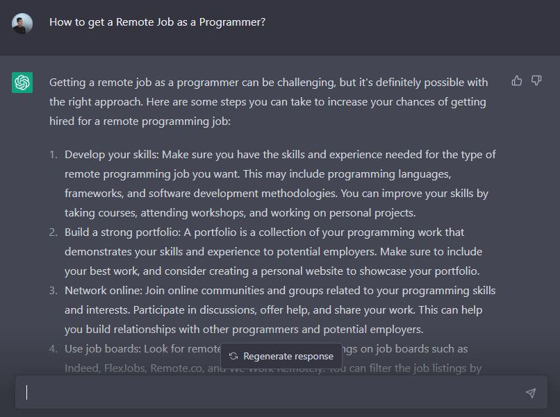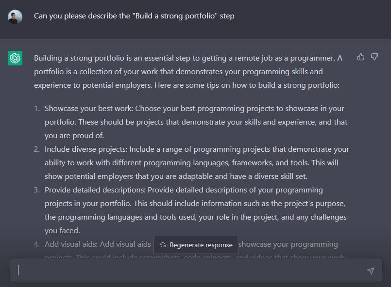 要是学习新技术有啥疑问,这平台可就成能用上的工具了。不管是问“如何获得程序员的远程工作”,还是关于基础的代码问题,它都能妥妥答复。而且针对它之前给出的数据,咱还能提后续问题,它仿佛有无限耐心一样,会为咱把问题解释得明明白白儿的。再对比其他付费教程,平台这种问答模式方便多了。