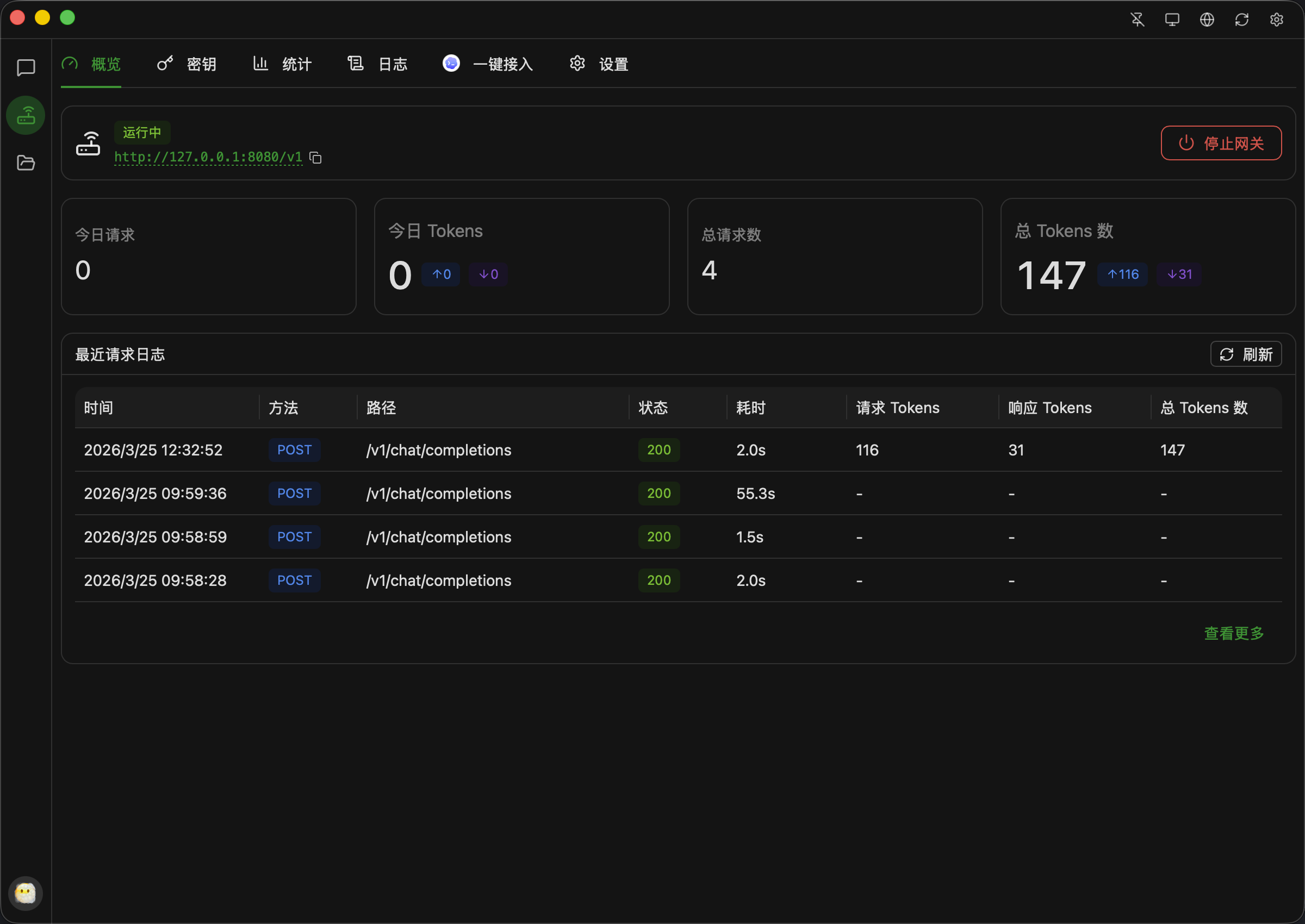 • 本地 API 网关 — 内置 OpenAI 兼容、Claude、Gemini等原生接口的本地 API 服务器,可作为任意兼容客户端的后端