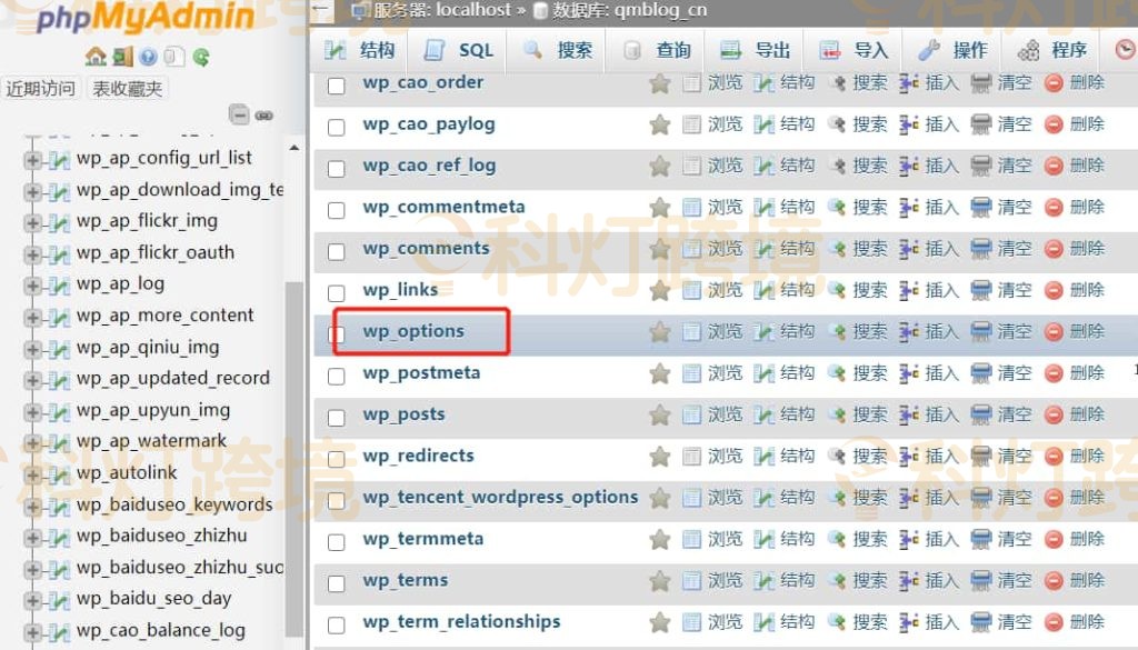 然后进入到对应网站的数据库,点击进入 wp_options 这个表(表前缀可能不是 wp_)。