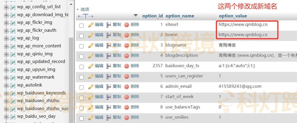 然后就可以看到数据库的 siteurl 和 home 这两个选项,将他们的值修改为新网址。