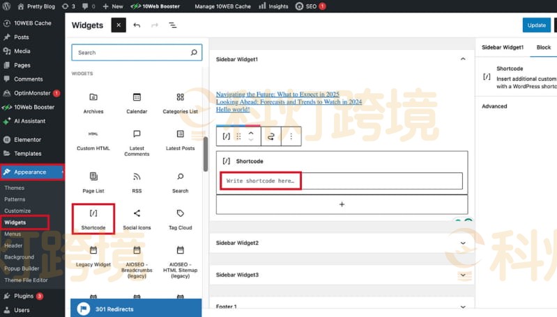 - 访问 WordPress 仪表板,从左侧边栏中选择 外观,然后单击小部件。