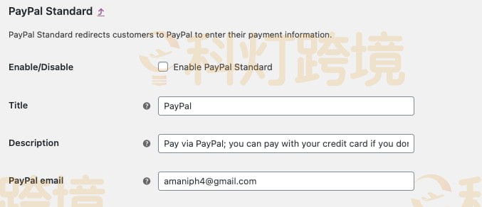 - 启用/Disable-使用此复选框可启用或禁用网站上的 PayPal Standard 功能。