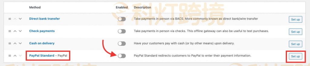 WooCommerce支持Paypal、Stripe、信用卡等多种收款方式,WooCommerce默认的付款方式,可以从Woocoomerce-Setting-Payments进入WooCommerce的支付设置页面,下图是安装完WooCommerce后的初始支付方式,总共有以下四种。