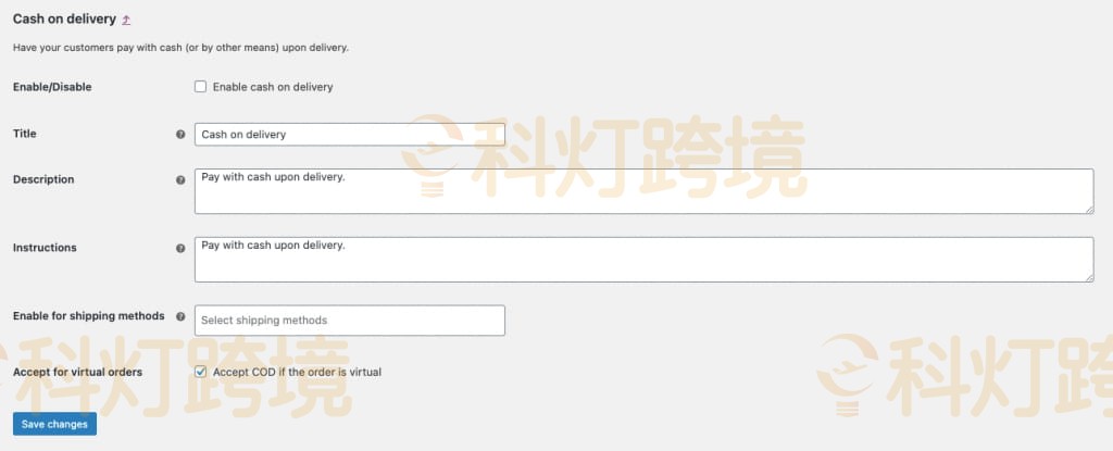 - 接受虚拟订单-如果商店提供虚拟产品,并且接受虚拟订单的货到付款,则启用此选项,如果没有,则关闭此选项。
