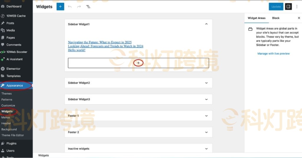单击 Widgets 或 Sidebar 部分,然后选择要添加侧边栏的区域(例如博客侧边栏、页脚侧边栏),点击 Add a Widget 按钮。