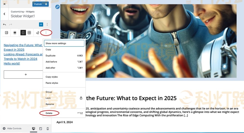 删除小部件:通过单击三个点图标并删除打开第一个小部件,该小部件将从预览的侧边栏中消失。