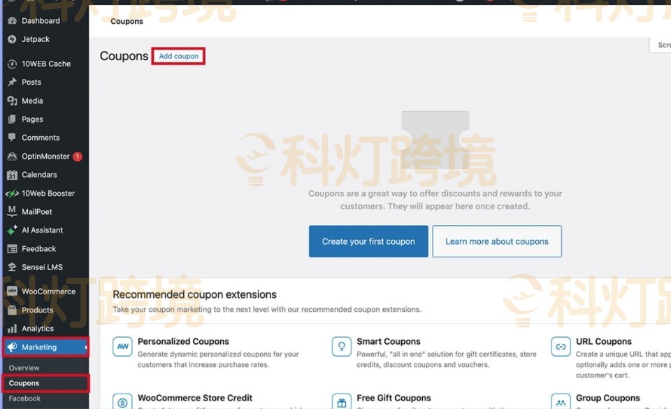 从 WooCommerce 菜单中,选择营销 ,然后选择优惠券,按 Add coupon 按钮。