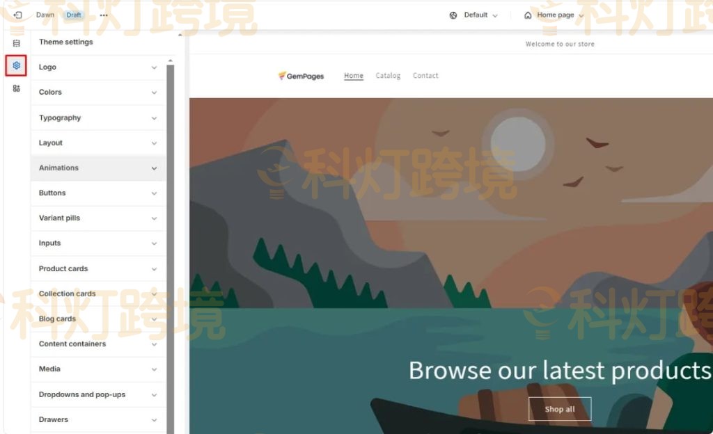 要访问Shopify主题设置,请单击屏幕左上角的齿轮图标主题设置,然后会弹出 Shopify 自定义菜单。