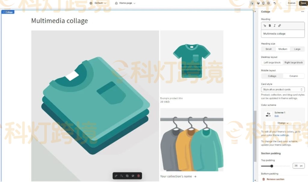 例如对于 Collage 部分,可以确定要展示的电商独立站产品系列和要展示的产品。