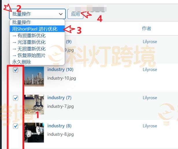 还可以同时多选几张图片,然后在批量操作中,选择Shortpixel进行优化,然后点选应用,即可对所选图片进行优化。