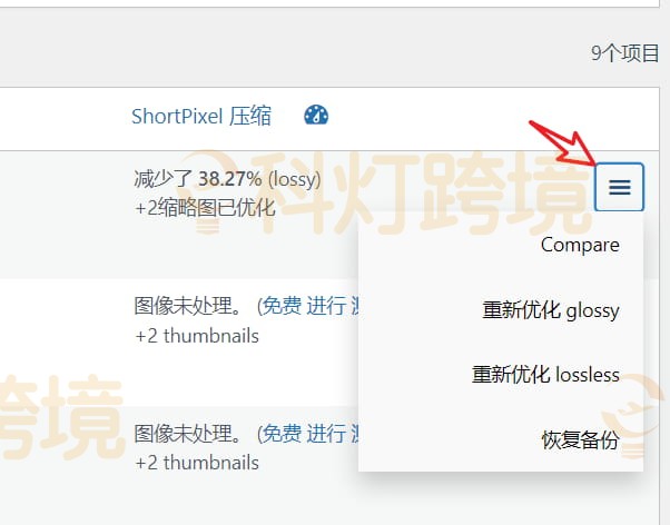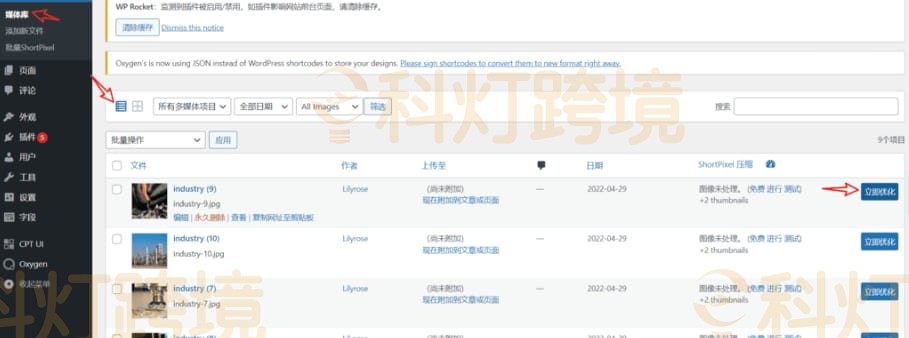 在媒体库中还可以使用ShortPixel图像优化插件针对每一张图片点击立即优化按钮进行优化。
