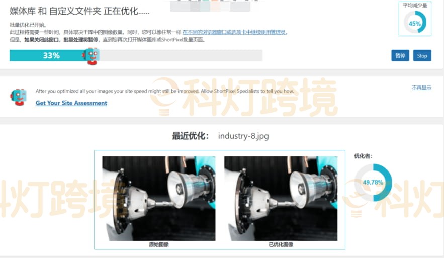 下面便是进度图,也能看到图片优化的压缩量,还有暂停与停止优化的按钮满足需要。