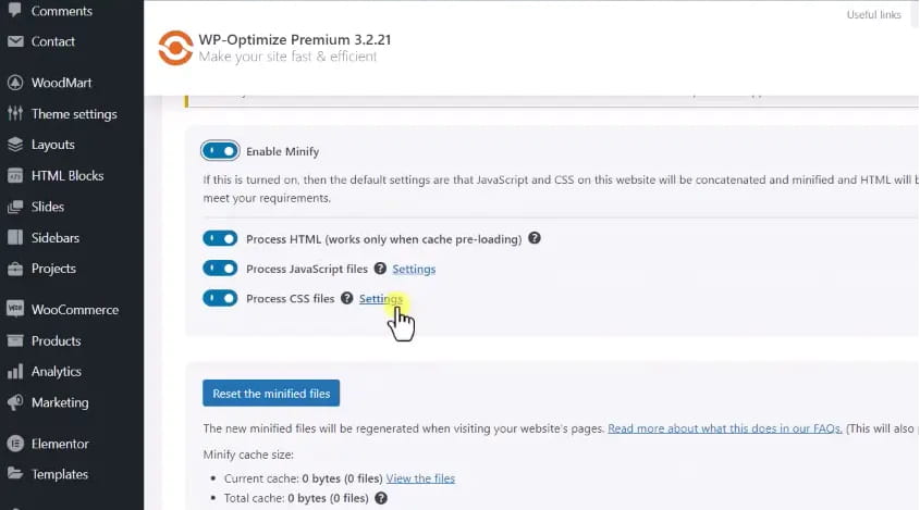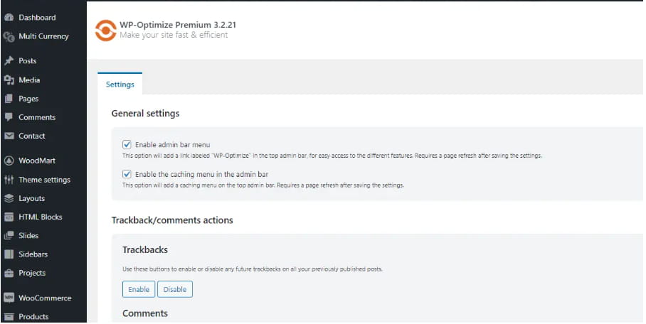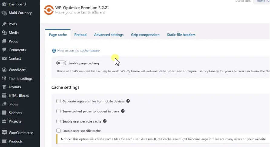 第一个设置是常规设置,勾选“在menu上面是否显示性能优化插件的图标”,保存以后在上方就可以看到这里有一个快捷的入口;另外一个就是激活缓存的菜单,在WP Optimize的admin中,直接可以在这里进行缓存。