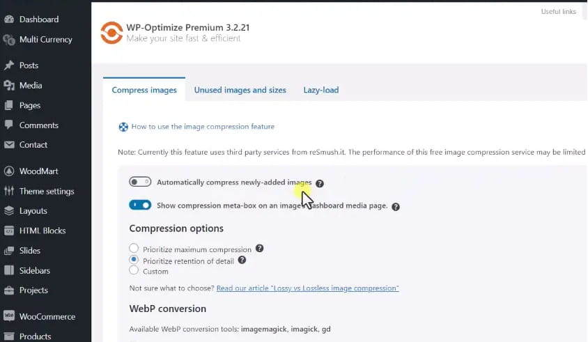 接下来的选项是针对已经上传的图片进行压缩。想优化哪些图片,直接勾选这些图片就行了;也可以直接优化所有的图片;还有一种就是把图片转成webp格式;