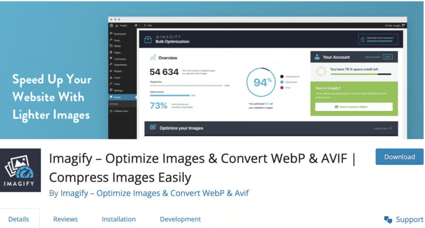 Imagify支持无损/有损压缩和WebP 和 AVIF 格式,每月可免费试用200次,并且提供批量文件压缩和图像恢复服务,能够在上传时自动压缩图像、批量优化媒体库项目、将文件转换为 WebP/AVIF 以及保留原始图像。不过Imagify在删除 EXIF 数据和GIF 文件上的功能存在局限性。