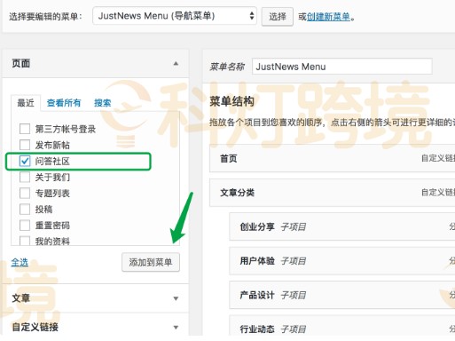 如需将问答列表页面添加到WordPress外贸独立站的导航菜单,可以进入后台外观-菜单,选择当前网站的导航菜单进行编辑,然后将左边页面选项下选择上一步创建的问答列表页面,点击添加到菜单,然后保存菜单,如图: