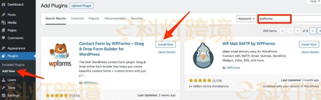 通过WordPress仪表盘,在插件-添加新插件中,在搜索栏中输入“WPForms”。