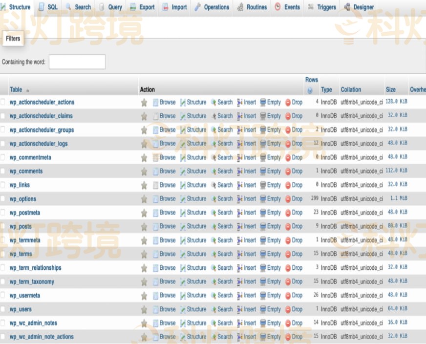 接下来单击数据库并从菜单中选择网站,现在应该会看到 WordPress 数据库中的所有表: