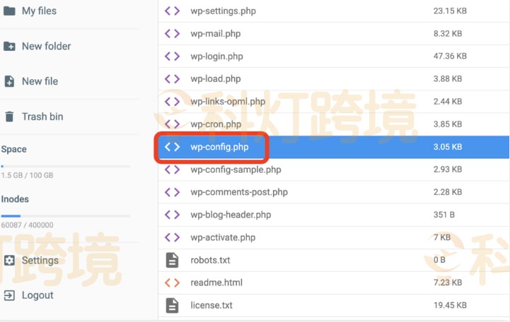 在面板中打开文件管理器后,将看到多个目录和文件。wp-config.php 的位置完全取决于安装WordPress的位置,在 hPanel 中,安装路径通常为 /public_html/wp-config.php。