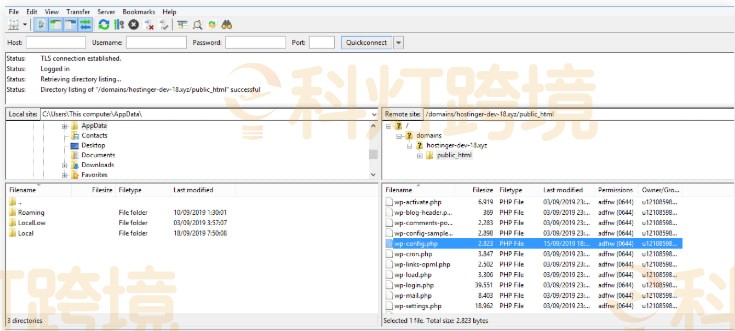 配置 FileZilla 后,通过访问 File – Site Manager 进行连接。成功登录 FTP 帐户后,将在屏幕右侧看到主机主目录,如果没有将WordPress安装在子文件夹中,则 wp-config.php 文件应该在那里。