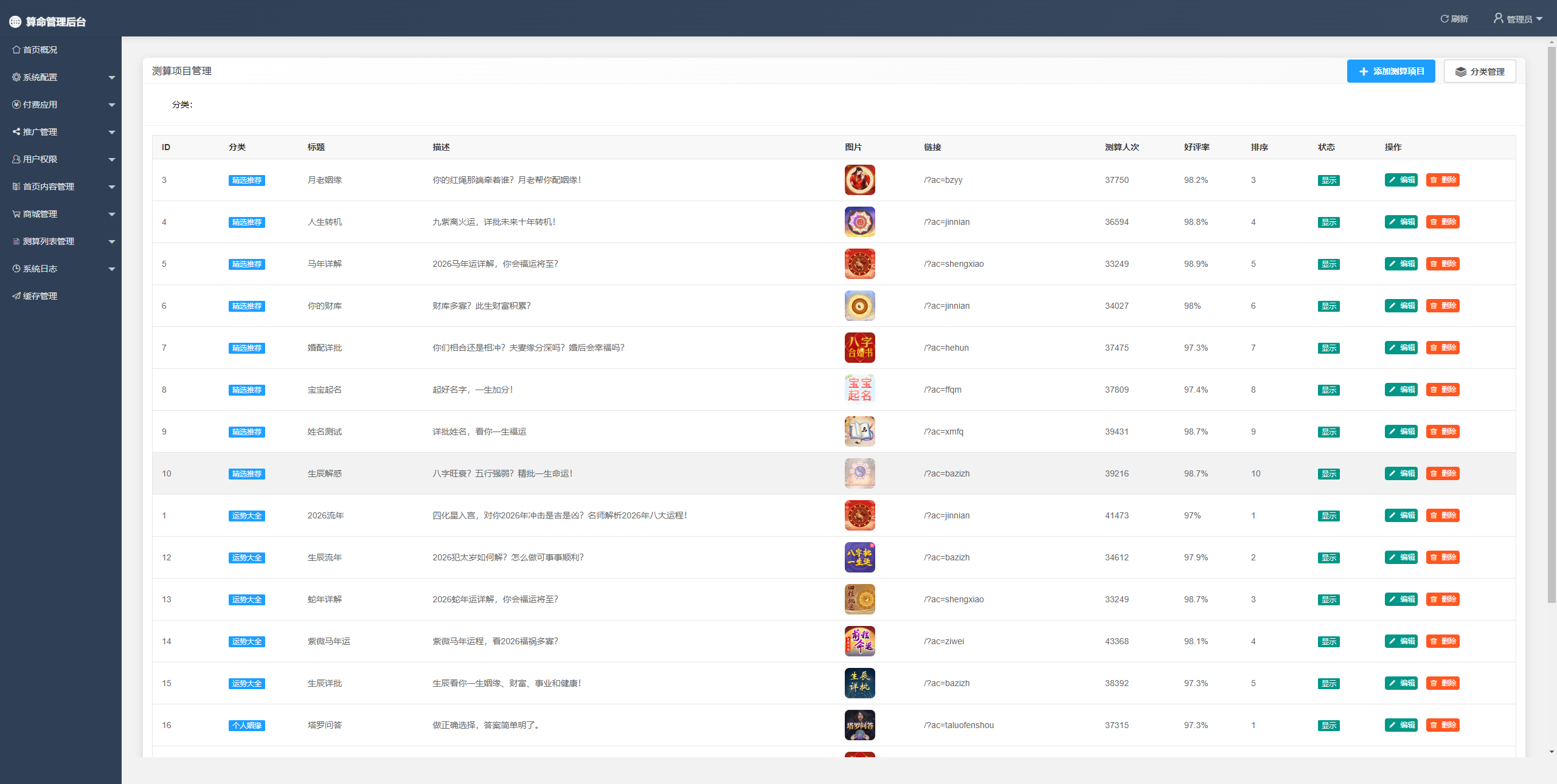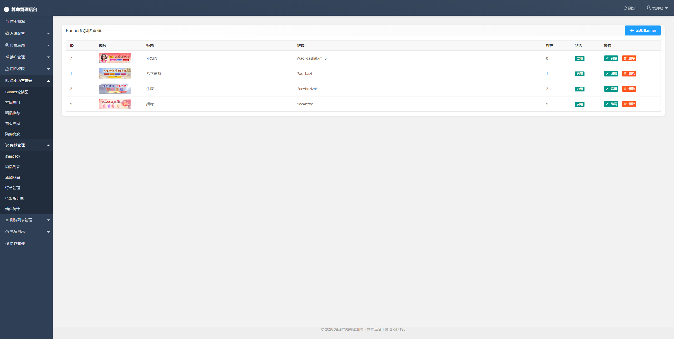 2026年更新 后台框架改用layui 更加稳定 美观 前端首页后台可控制项目 图片 新增商城功能 更新马年运势模板/八字神煞/八字终身运/ 新增塔罗问答模板 新增个人运势免费查看 新增择吉日(结婚吉日/订婚吉日/领证吉日/搬家吉日/开业吉日/入宅(迁新居)吉日/装修吉日/出行吉日/开工吉日/买车/提车吉日/动土吉日/提亲吉日/买房吉日/理发吉日/签约吉日)