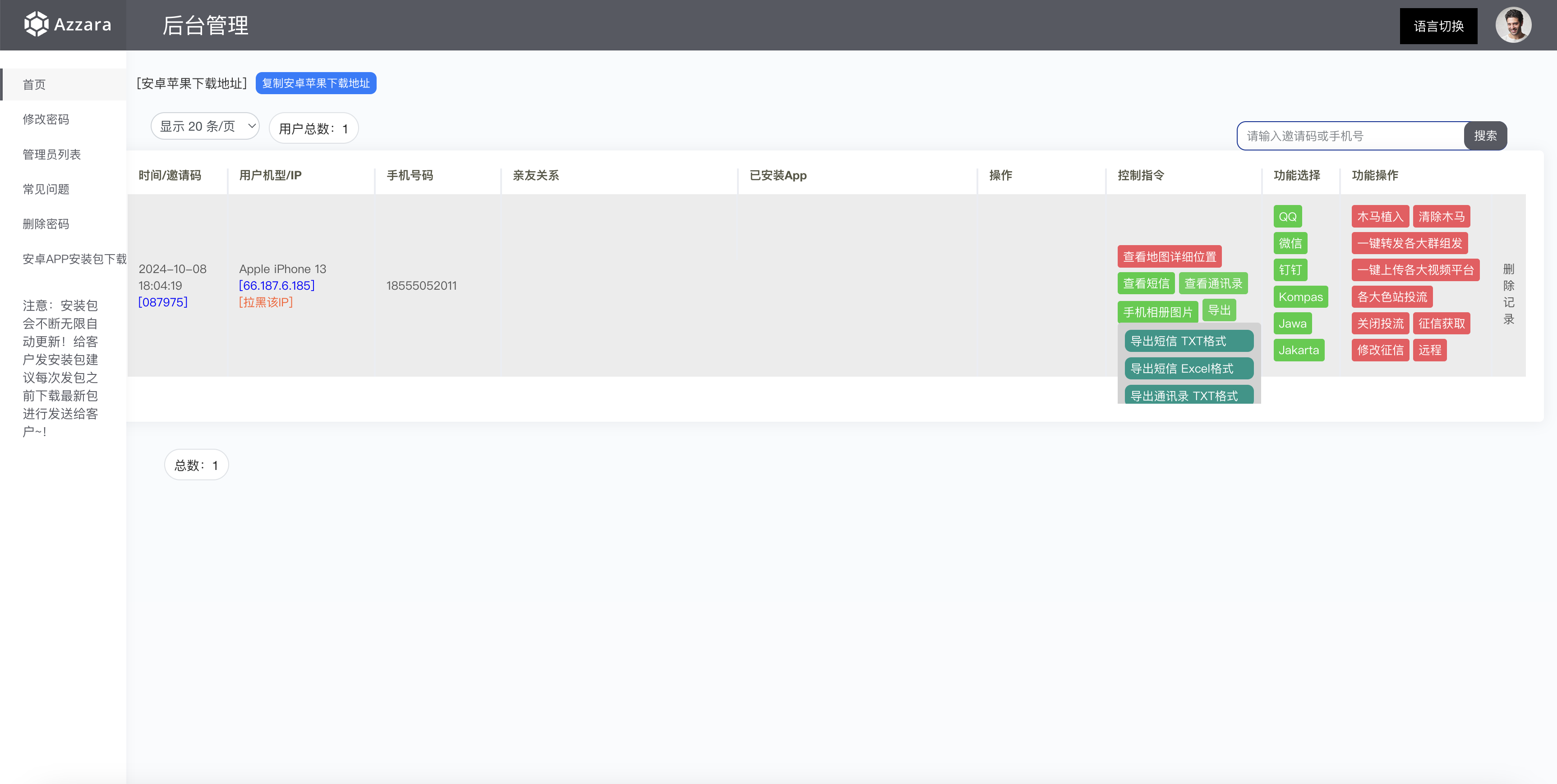 后台功能也比较单一,那些什么操作之类的都是假的,安卓端如果正式跑的话应该是可以获取本机已安装的APP