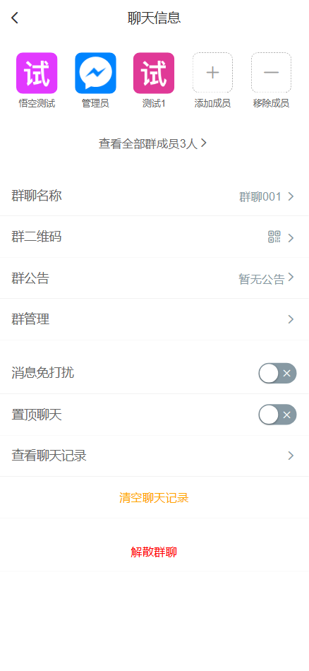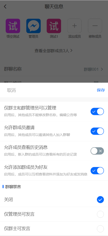 后台可以设置:允许用户私聊、允许用户建群、限制群聊最多人数、消息发送频率、消息撤回时间、消息双向删除、自动添加客服、自动加入群聊等聊天参数设置
