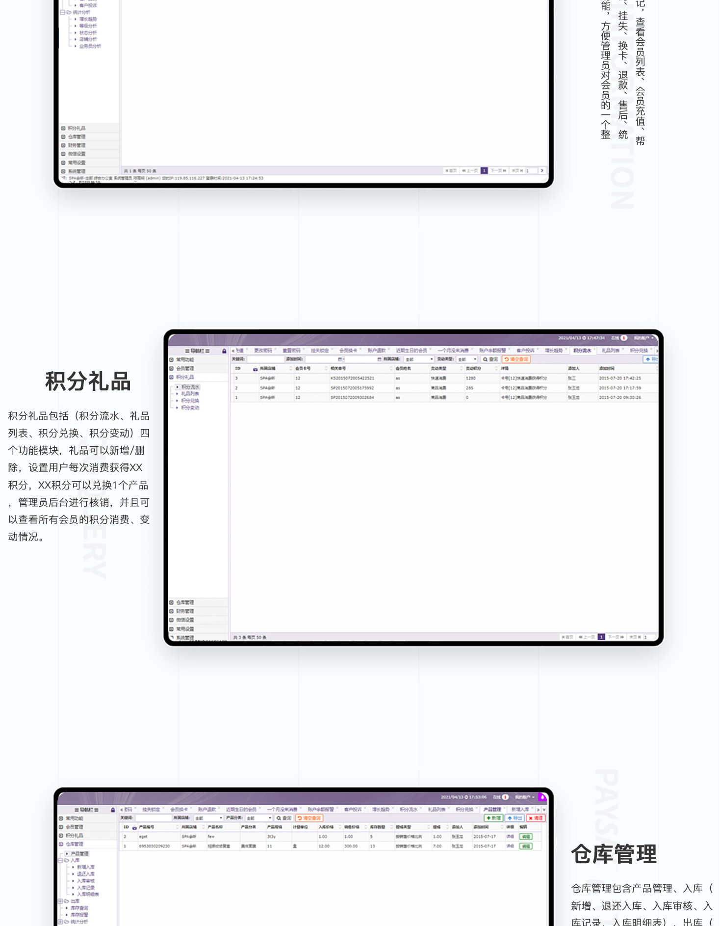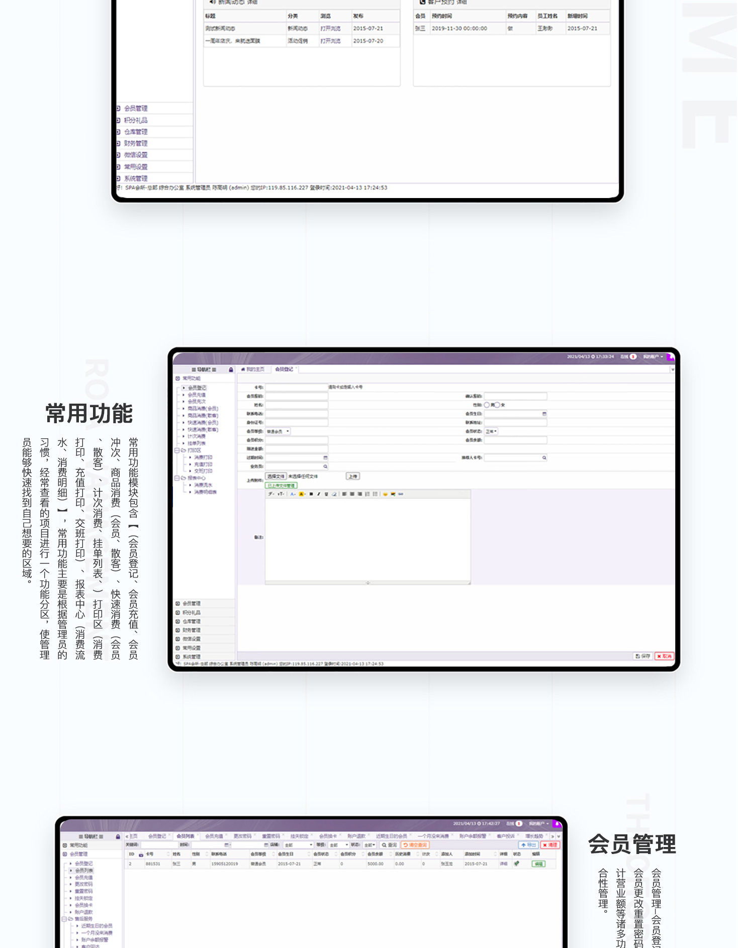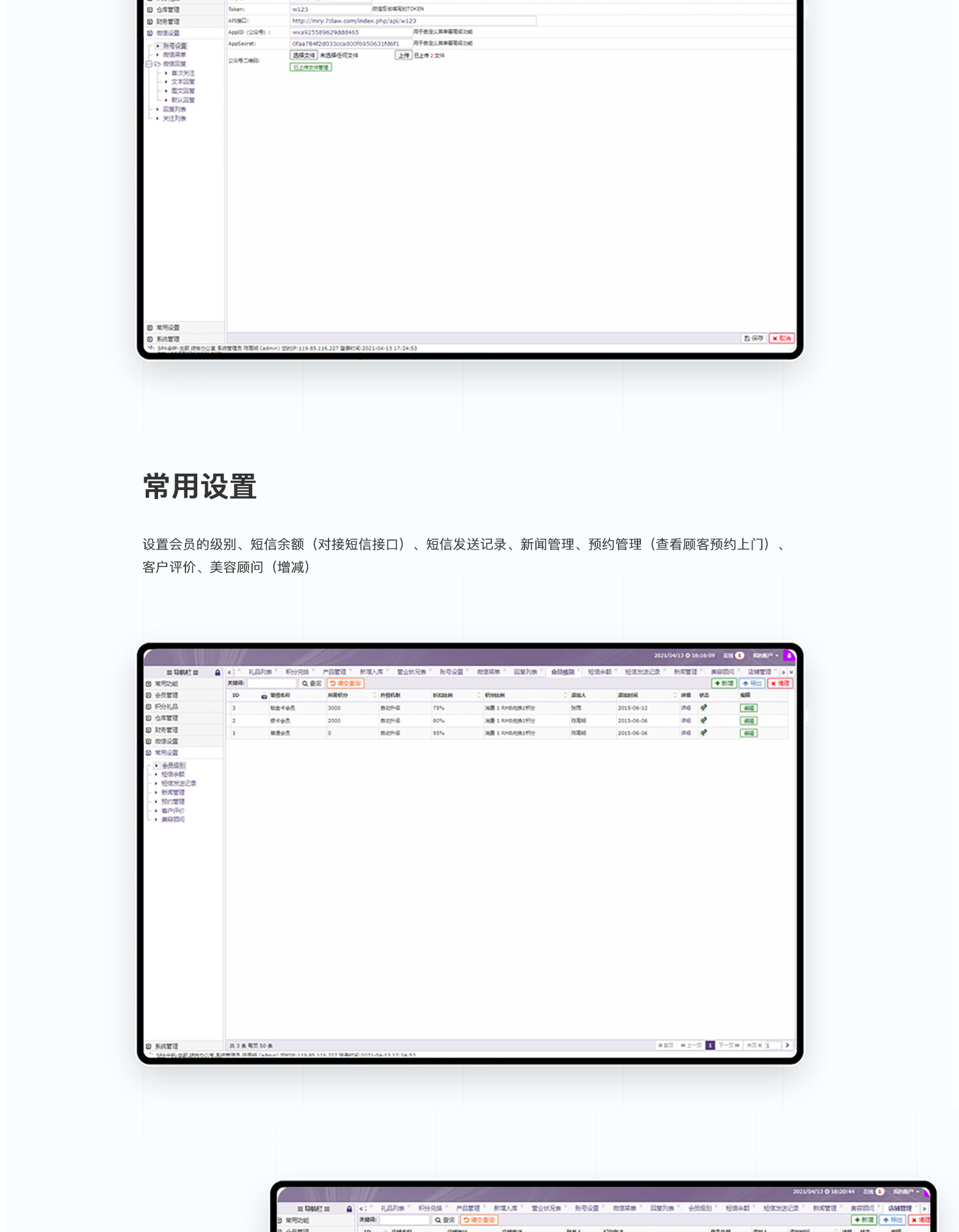 - 美容SPA会员管理系统,集vip会员、消费、收银、仓储管理系统带微信客户端为一体的系统,新手也可以简易入门,一般适用美容院,美发店,时装店,美甲加盟店,奢侈品店这些来搭建店内消费管理系统!