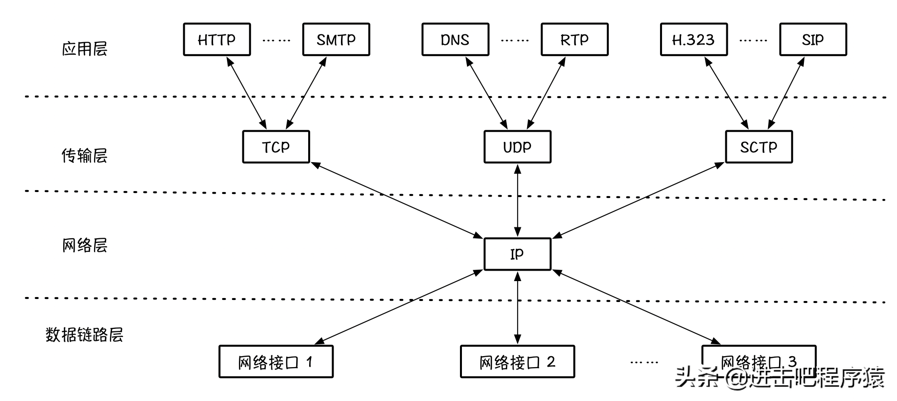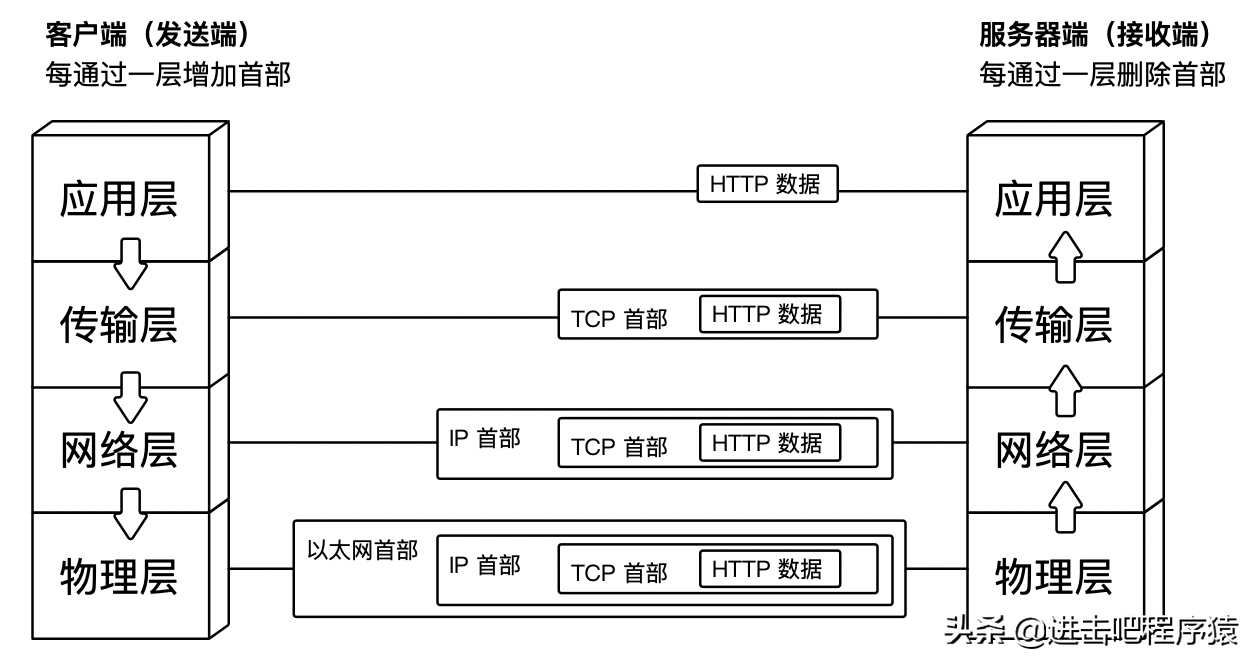 - 接受端的顺序是:链路层 -> 网络层 -> 传输层 -> 应用层。
