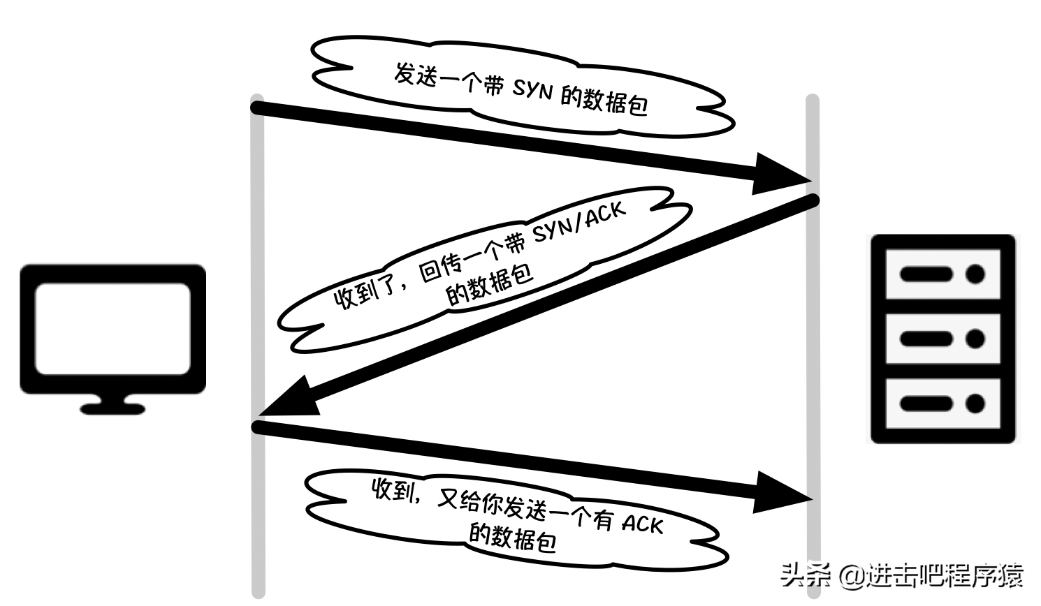 用 TCP 协议将数据包发送之后,它会向对方确认是否成功送达。握手过程中使用了 TCP 的标志(flag)——SYN(synchronize)和 ACK(acknowledgement)。