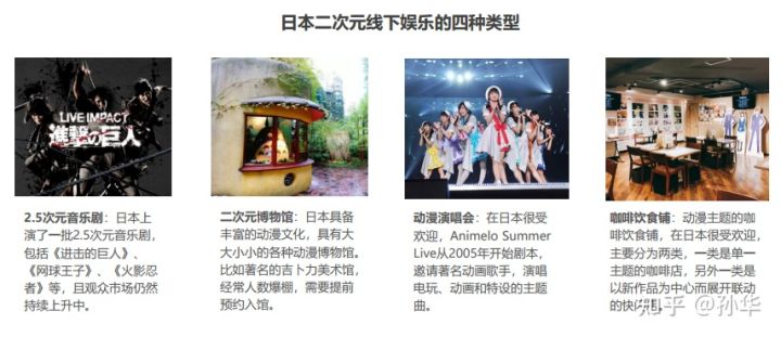 在提供线下服务的时候,可以参照日本的成熟市场,目前,新兴的二次元线下娱乐有四类2.5次元音乐剧、动漫博物馆、 动漫演唱会和动漫主题餐饮店。而这四种线下娱乐类型,是未来中国二次元企业可以参考的模式。