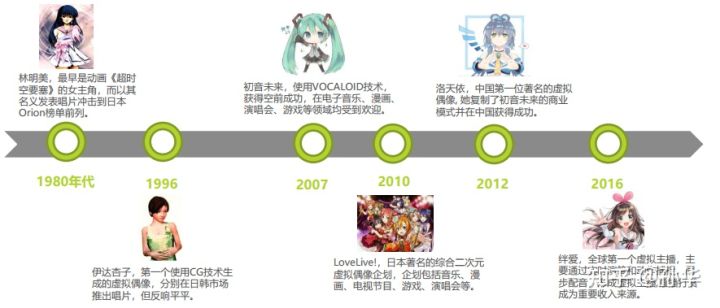 21世纪,真正把虚拟偶像带到消费者的眼前,是日本音乐软件公司CRYPTON,运用VOCALOID技术开发而成的 初音未来,自初音未来以后,诞生了一批虚拟偶像。虚拟偶像的厂商们不断探索变现渠道,逐渐形成了较为成熟的商业模式。