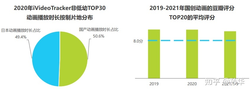 根据iVideoTracker的数据,2020年按照独立设备数排列的TOP30中, 国产动画作品月均播放时长已经超过了海外作品。除了播放时长超过日本动画以外,国创动画的质量也受到观众们的 认可,2019年-2021年前9个月,评分最高20部国创动画的平均分在8分以上。