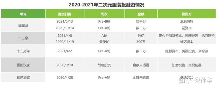 目前2020-2021年集中的 融资领域包括内容制作环节的漫画企业与二次元游戏企业,另外一些周边衍生企业包括二次元电商,二次元服饰等也开始 获得资本的青睐,说明在二次元内容产业的一些细分领域,以及整个周边衍生领域,都有较好的发展机会。 从另外一方面看,2012-2020年,单笔融资金额处于上升的趋势,说明待融资企业具备一定规模,整个二次元产业已经脱 到了初步发展期,进入到成熟期。
