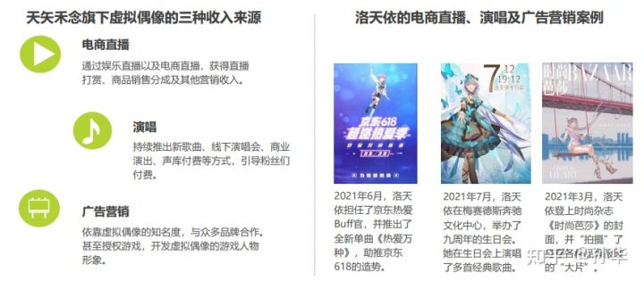 目前,天矢禾念不仅仅通过出售虚拟歌姬的演唱服务,很大部分来自广告营销收入。另外,它还积极拓展虚拟偶像的电商 直播业务。