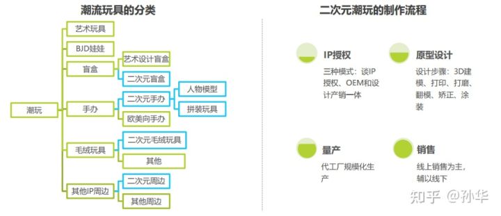 二次元潮玩多是与知名、成熟IP合作,合作方式主要是手办厂商和IP洽谈授权事宜、还有IP方委托OEM厂商进行设计和生 产,还有一些是由IP方自行进行设计,并自建工厂进行生产。在IP授权以后,还必须经过原型制作环节,由手办工作室进行 设计,等到原型设计通过监修,就可以送去量产,而销售渠道主要还是以线上电商为主,以线下渠道为辅。