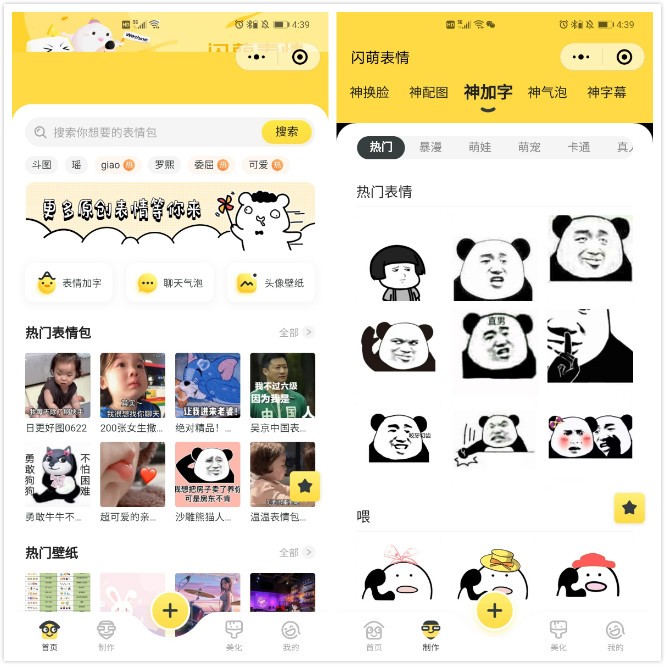 操作很简单,而且非常好用的表情包制作工具,不仅可以搜索各种热门的表情包,最好玩、有用的还是可以自己制作表情包。并且表情包资源模板分类很清晰,很快就能找到自己喜欢的类型,一键套用。