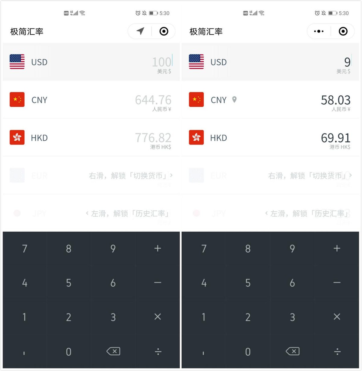 一款简洁轻量、支持全球多种货币汇率换算的小程序,例如在人民币那输入100元,那对应其他国家货币是多少立马能显示出来,使用起来非常方便。