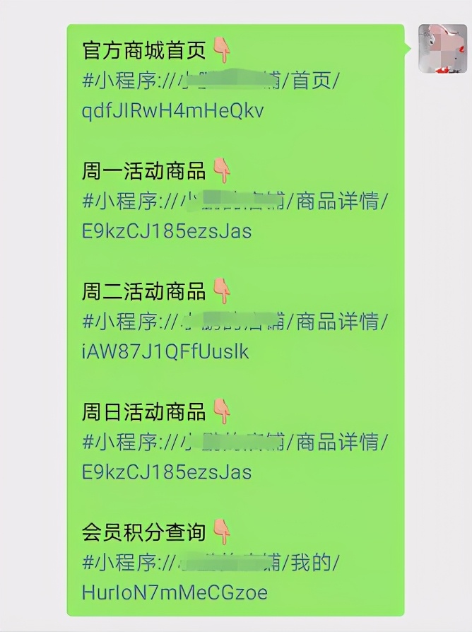 除以上的设置外,还有就是我们最常见的使用方式,就是我们的好友对话/微信群/朋友圈,都可以点击链接直接进入小程序商城相应页面。